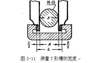 用游標卡尺測量T形槽的寬度,如圖2-11所示。測量時將量爪外緣端面的小平面,貼在零件凹槽的平面上,用固定螺釘把微動裝置固定,轉(zhuǎn)動調(diào)節(jié)螺母,使量爪的外測量面輕輕地與T形槽表面接觸,并放正兩量爪的位置 (可以輕輕地擺動一個量爪,找到槽寬的垂直位置),讀出游標卡尺的讀數(shù)圖2-11中用A表示。但由于它是用量爪的外測量面測量內(nèi)尺寸的,卡尺上所讀出的讀數(shù)A是量爪內(nèi)測量面之間的距離,因此必須加上兩個量爪的厚度b,才是T形槽的寬度。所以,T形槽的寬度L=A+b。