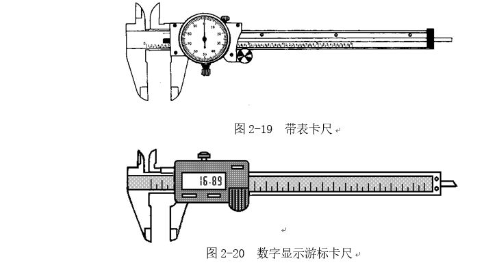 以上所介紹的各種游標卡尺都存在一個共同的問題,就是讀數不很清晰,容易讀錯,有時不得不借放大鏡將讀數部分放大?,F(xiàn)有游標卡尺采用無視差結構,使游標刻線與主尺刻線處在同一平面上,消除了在讀數時因視線傾斜而產生的視差;有的卡尺裝有測微表成為帶表卡尺(圖2-19),便于讀數準確,提高了測量精度;更有一種帶有數字顯示裝置的游標卡尺(圖2-20),這種游標卡尺在零件表面上量得尺寸時,就直接用數字顯示出來,其使用極為方便。