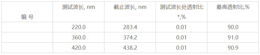 一、定值方法和溯源性根據(jù)JG1034-2008光譜光度計(jì)標(biāo)準(zhǔn)濾光器檢定規(guī)程,開機(jī)預(yù)熱30min后,以空氣作參比,測(cè)量標(biāo)準(zhǔn)物質(zhì)的截止波長(zhǎng)、測(cè)試波長(zhǎng)處透射比及最高透射比,連續(xù)測(cè)量3次,取3次測(cè)量的平均值作為測(cè)量結(jié)果。標(biāo)準(zhǔn)物質(zhì)量值溯源至中國計(jì)量科學(xué)研究院。