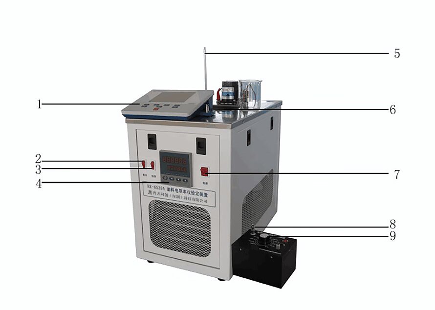 1.電導(dǎo)率儀 2.制冷開關(guān) 3.加熱開關(guān) 4.溫度控制器 5.校準溫度計 6.燒杯 7.電源開關(guān) 8.TNC接口 9.電導(dǎo)率測定儀標準裝置