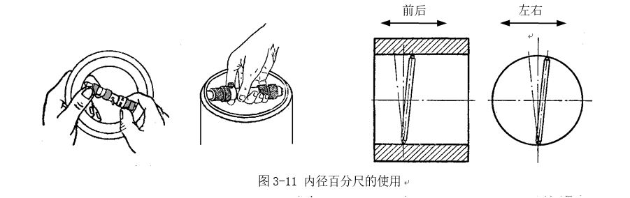 內(nèi)徑百分尺上,沒有測(cè)力裝置,測(cè)量壓力的大小完全靠手中的感覺。測(cè)量時(shí),是把它調(diào)整到所測(cè)量的尺寸后(圖3-11),輕輕放入孔內(nèi)試測(cè)其接觸的松緊程度是否合適。一端不動(dòng),另一端作左、右、前、后擺動(dòng)。左右擺動(dòng),必須細(xì)心地放在被測(cè)孔的直徑方向,以點(diǎn)接觸,即測(cè)量孔徑的最大尺寸處(最大讀數(shù)處),要防止如圖3-12所示的錯(cuò)誤位置。前后擺動(dòng)應(yīng)在測(cè)量孔徑的最小尺寸處(即最小讀數(shù)處)。按照這兩個(gè)要求與孔壁輕輕接觸,才能讀出直徑的正確數(shù)值。測(cè)量時(shí),用力把內(nèi)徑百分尺壓過(guò)孔徑是錯(cuò)誤的。這樣做不但使測(cè)量面過(guò)早磨損,且由于細(xì)長(zhǎng)的測(cè)量桿彎曲變形后,既損傷量具精度,又使測(cè)量結(jié)果不準(zhǔn)確。