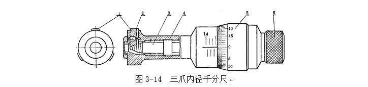 三爪內(nèi)徑千分尺的工作原理,圖3-14為測(cè)量范圍11~14mm的三爪內(nèi)徑千分尺,當(dāng)順時(shí)針旋轉(zhuǎn)測(cè)力裝置6時(shí),就帶動(dòng)測(cè)微螺桿3旋轉(zhuǎn),并使它沿著螺紋軸套4的螺旋線方向移動(dòng),于是測(cè)微螺桿端部的方形圓錐螺紋就推動(dòng)三個(gè)測(cè)量爪1作徑向移動(dòng)。扭簧2的彈力使測(cè)量爪緊緊地貼合在方形圓錐螺紋上,并隨著測(cè)微螺桿的進(jìn)退而伸縮。