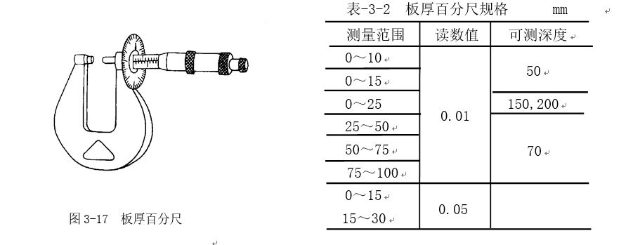 板厚百分尺如圖3-17所示。主要適用于測(cè)量板料的厚度尺寸。其規(guī)格見(jiàn)表3-2。
