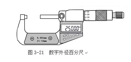近來,我國有數(shù)字外徑百分尺(圖3-21),用數(shù)字表示讀數(shù),使用更為方便。還有在固定套筒上刻有游標(biāo),利用游標(biāo)可讀出0.002或0.001mm的讀數(shù)值。