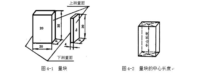 長度量塊是用耐磨性好,硬度高而不易變形的軸承鋼制成矩形截面的長方塊,如圖4-1所示。它有上、下兩個(gè)測量面和四個(gè)非測量面。兩個(gè)測量面是經(jīng)過精密研磨和拋光加工的很平、很光的平行平面。量塊的矩形截面尺寸是:基本尺寸0.5~10mm的量塊,其截面尺寸為30mm×9mm;基本尺寸大于10至1000mm,其截面尺寸為35mm×9mm。