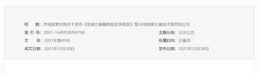 根據(jù)《中華人民共和國(guó)計(jì)量法》有關(guān)規(guī)定,現(xiàn)批準(zhǔn)《密度計(jì)量器具檢定系統(tǒng)表》等24項(xiàng)國(guó)家計(jì)量技術(shù)規(guī)范發(fā)布實(shí)施。