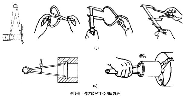 用巳在鋼直尺上或在外卡鉗上取好尺寸的內卡鉗去測量內徑,圖1-8a 所示。就是比較內卡鉗在零件孔內的松緊程度。如內卡鉗在孔內有較大的自由擺動時,就表示卡鉗尺寸比孔徑內小了;如內卡鉗放不進,或放進孔內后緊得不能自由擺動,就表示內卡鉗尺寸比孔徑大了,如內卡鉗放入孔內,按照上述的測量方法能有1~2mm的自由擺動距離,這時孔徑與內卡鉗尺寸正好相等。測量時不要用手抓住卡鉗測量,圖1-8b 所示,這樣手感就沒有了,難以比較內卡鉗在零件孔內的松緊程度,并使卡鉗變形而產(chǎn)生測量誤差。