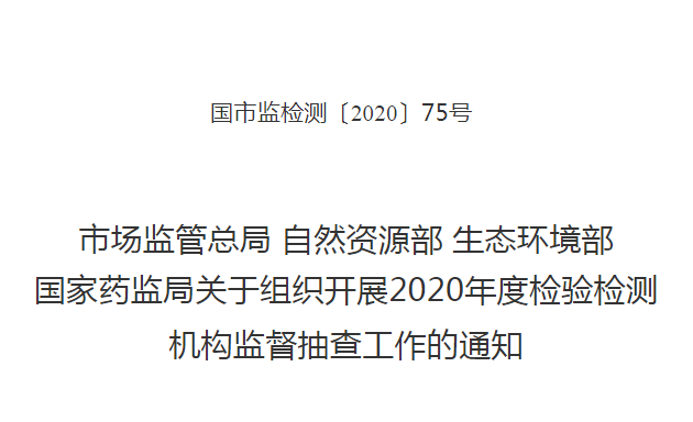 2020年5月14日,市場監(jiān)管總局、自然資源部、生態(tài)環(huán)境部、國家藥監(jiān)局聯(lián)合發(fā)布了《關(guān)于組織開展2020年度檢驗(yàn)檢測機(jī)構(gòu)監(jiān)督抽查工作的通知》。通知顯示,為加強(qiáng)檢驗(yàn)檢測機(jī)構(gòu)監(jiān)管,營造公平有序的市場環(huán)境,為疫情防控和經(jīng)濟(jì)社會發(fā)展提供技術(shù)支撐,市場監(jiān)管總局、自然資源部、生態(tài)環(huán)境部和國家藥監(jiān)局決定于2020年6月至10月在全國范圍內(nèi)組織開展檢驗(yàn)檢測機(jī)構(gòu)“雙隨機(jī)、一公開”監(jiān)督抽查。