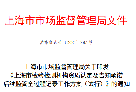 5月24日,上海市市場監(jiān)管局發(fā)布《上海市檢驗檢測機構(gòu)資質(zhì)認定及告知承諾后續(xù)監(jiān)管全過程記錄工作方案(試行)》?!豆ぷ鞣桨福ㄔ囆校诽岢?,上海市檢驗檢測機構(gòu)資質(zhì)認定所有審批事項(包括首次、復查、擴項、變更)及告知承諾后續(xù)監(jiān)管實施全過程記錄。其中,對上海市檢驗檢測機構(gòu)資質(zhì)認定現(xiàn)場評審及告知承諾后續(xù)監(jiān)管現(xiàn)場檢查實施全程音像記錄。