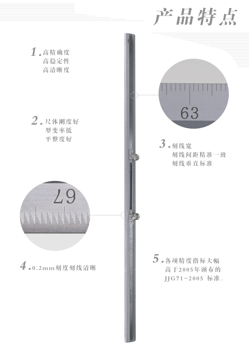 普天同創(chuàng)(深圳)科技有限公司自己主研發(fā)PTTC-ZC1型三等標(biāo)準(zhǔn)金屬線(xiàn)紋尺,作為自主知識(shí)產(chǎn)權(quán)的高科技、創(chuàng)新型二十一世紀(jì)新產(chǎn)品,集現(xiàn)代科技、加工中心全自動(dòng)化制作工藝技術(shù),采用激光刻制刻劃線(xiàn)、標(biāo)選讀數(shù)與圖型。產(chǎn)品具有高精確度、高穩(wěn)定性、高清晰度,刻線(xiàn)寬、刻線(xiàn)間距精準(zhǔn)一致,刻線(xiàn)垂直標(biāo)準(zhǔn),尺體剛度好,型變率低,平整度好,各項(xiàng)精度指標(biāo)大幅高于2005年頒布的JJG71-2005 標(biāo)準(zhǔn)。