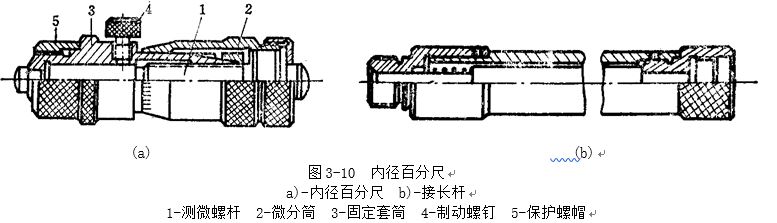 內(nèi)徑百分尺如圖3-10a所示,其讀數(shù)方法與外徑百分尺相同。內(nèi)徑百分尺主要用于測(cè)量大孔徑,為適應(yīng)不同孔徑尺寸的測(cè)量,可以接上接長(zhǎng)桿(如圖3-10b)。連接時(shí),只須將保護(hù)帽5旋去,將接長(zhǎng)桿的右端(具有內(nèi)螺紋)旋在百分尺的左端即可。接長(zhǎng)桿可以一個(gè)接一個(gè)地連接起來,測(cè)量范圍最大可達(dá)到5000mm。內(nèi)徑百分尺與接長(zhǎng)桿是成套供應(yīng)的。目前,國產(chǎn)內(nèi)徑百分尺的測(cè)量范圍(mm)