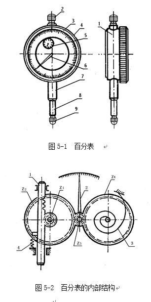 圖5-2是百分表內部機構的示意圖。帶有齒條的測量桿1的直線移動,通過齒輪傳動(Z1 、Z2 、 Z3),轉變?yōu)橹羔?的回轉運動。齒輪Z4和彈簧3使齒輪傳動的間隙始終在一個方向,起著穩(wěn)定指針位置的作用。彈簧4是控制百分表的測量壓力的。百分表內的齒輪傳動機構,使測量桿直線移動1mm時,指針正好回轉一圈。