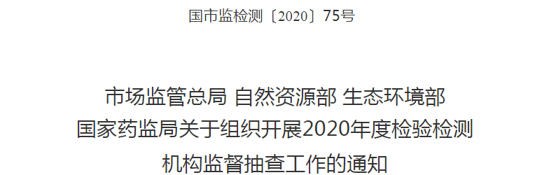 2020年5月14日,市場(chǎng)監(jiān)管總局、自然資源部、生態(tài)環(huán)境部、國(guó)家藥監(jiān)局聯(lián)合發(fā)布了《關(guān)于組織開展2020年度檢驗(yàn)檢測(cè)機(jī)構(gòu)監(jiān)督抽查工作的通知》。通知顯示,為加強(qiáng)檢驗(yàn)檢測(cè)機(jī)構(gòu)監(jiān)管,營(yíng)造公平有序的市場(chǎng)環(huán)境,為疫情防控和經(jīng)濟(jì)社會(huì)發(fā)展提供技術(shù)支撐,市場(chǎng)監(jiān)管總局、自然資源部、生態(tài)環(huán)境部和國(guó)家藥監(jiān)局決定于2020年6月至10月在全國(guó)范圍內(nèi)組織開展檢驗(yàn)檢測(cè)機(jī)構(gòu)“雙隨機(jī)、一公開”監(jiān)督抽查。
