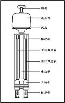 通風(fēng)干濕表的構(gòu)造如圖所示,主要由干濕球溫度表、通風(fēng)器、附件組成。通風(fēng)器采用機械裝置對干濕球溫度表的感應(yīng)球部進(jìn)行強制通風(fēng),保證感應(yīng)球部周圍的通風(fēng)速度穩(wěn)定在2.5m/s。干濕球溫度表的感應(yīng)球部裝在雙重金屬護(hù)管內(nèi),護(hù)管通過三通管和中央圓管與通風(fēng)器相通。儀器附件有濕潤紗布用的吸儲水橡皮囊、擋風(fēng)罩等。由于通風(fēng)干濕表表面鍍有反射性能很好的鎳或鉻,同時溫度表感應(yīng)球部又處于能防止熱傳導(dǎo)的雙重護(hù)管中,所以通風(fēng)干濕表可以在太陽光下進(jìn)行觀測,是野外觀測的常用儀器,但由于有金屬機械部分,因此不能在雨天使用,以免機械生銹。