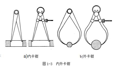 圖1-3是常見(jiàn)的兩種內(nèi)外卡鉗。內(nèi)外卡鉗是最簡(jiǎn)單的比較量具。外卡鉗是用來(lái)測(cè)量外徑和平面的,內(nèi)卡鉗是用來(lái)測(cè)量?jī)?nèi)徑和凹槽的。它們本身都不能直接讀出測(cè)量結(jié)果,而是把測(cè)量得的長(zhǎng)度尺寸 (直徑也屬于長(zhǎng)度尺寸),在鋼直尺上進(jìn)行讀數(shù),或在鋼直尺上先取下所需尺寸,再去檢驗(yàn)零件的直徑是否符合。
