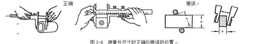 測量溝槽時,應(yīng)當(dāng)用量爪的平面測量刃進(jìn)行測量,盡量避免用端部測量刃和刀口形量爪去測量外尺寸。而對于圓弧形溝槽尺寸,則應(yīng)當(dāng)用刃口形量爪進(jìn)行測量,不應(yīng)當(dāng)用平面形測量刃進(jìn)行測量,如2-7所示。