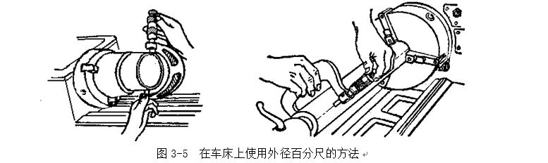 5 使用百分尺測量零件時(圖3-5),要使測微螺桿與零件被測量的尺寸方向一致。如測量外徑時,測微螺桿要與零件的軸線垂直,不要歪斜。測量時,可在旋轉測力裝置的同時,輕輕地晃動尺架,使測砧面與零件表面接觸良好。