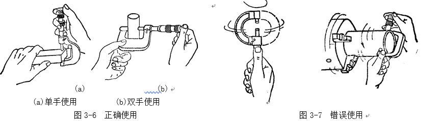 值得提出的是幾種使用外徑百分尺的錯誤方法,比如用百分尺測量旋轉運動中的工件,很容易使百分尺磨損,而且測量也不準確;又如貪圖快一點得出讀數(shù),握著微分筒來揮轉(圖3-7) 等,這同碰撞那樣,也會破壞百分尺的內(nèi)部結構。