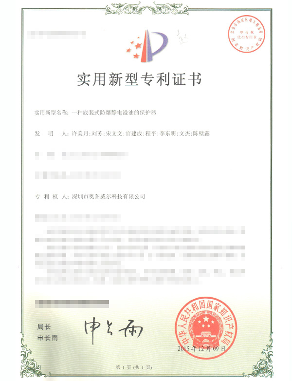 • 一種底裝式防爆靜電溢油的保護器